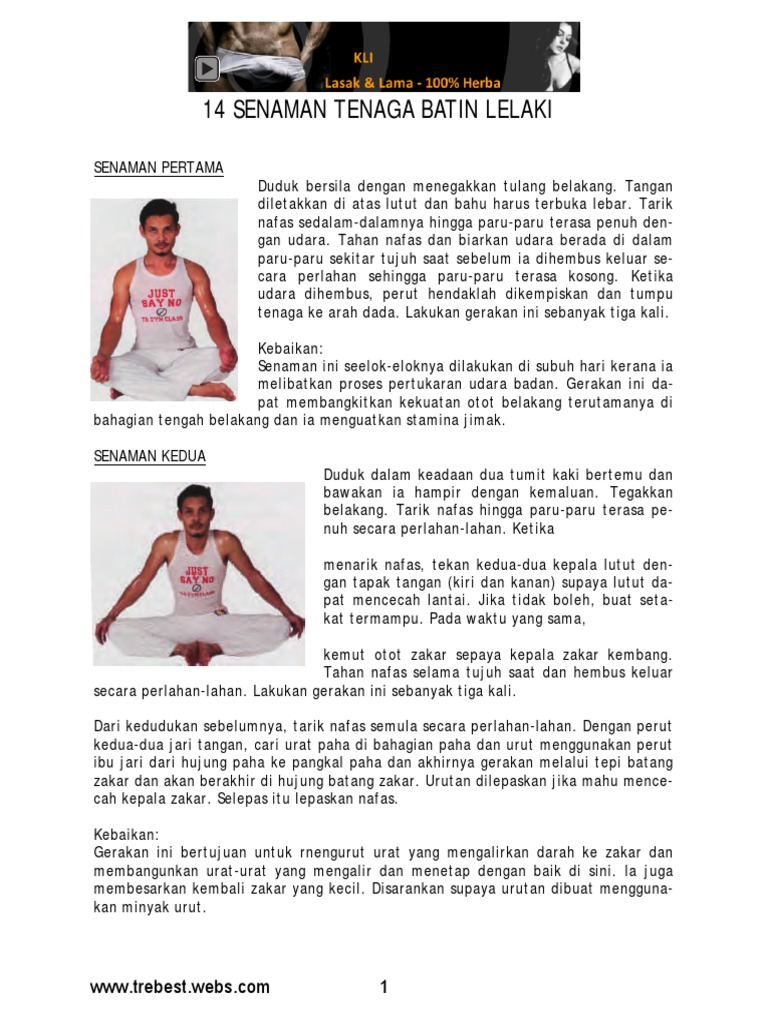 Senaman batin untuk suami. Senaman KEGEL utk lelaki lebih kuat tahan lama senamantenagabatin. Kebanyakannya adalah berkaitan dengan Ilmu Tabib dan sedikit-sedikit mempunyai pengaruh Islam.